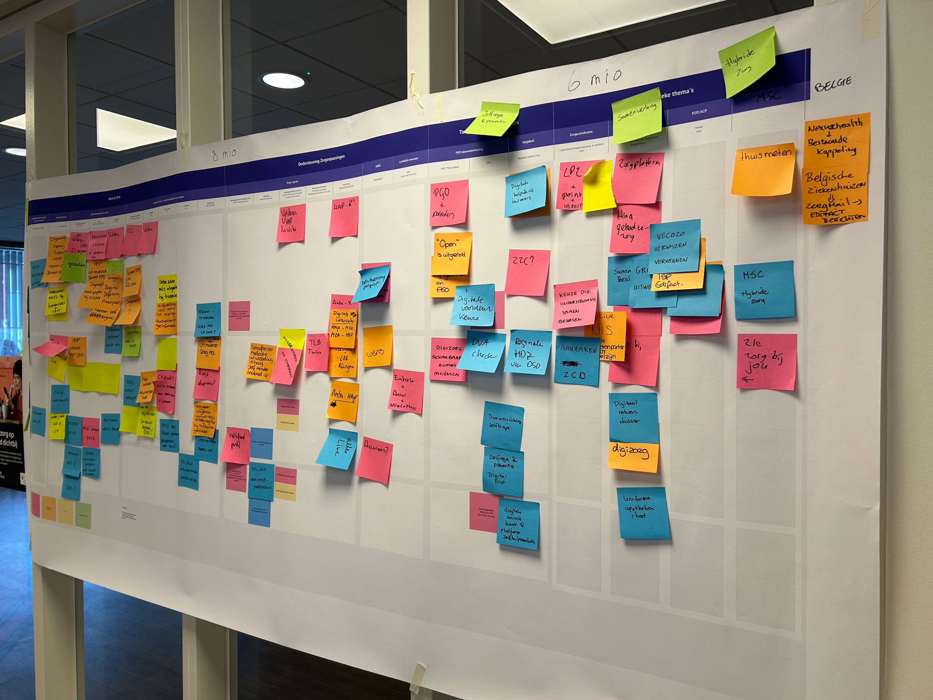 In juni zijn we twee ochtenden met de Zeeuwse Zorg Coalitie aan de slag gegaan. Tijdens deze sessies stond de werkagenda digitalisering in de regio Zeeland centraal. In de eerste sessie zijn we gestart met het toelichten van de onderwerpen op de werkagenda. Vervolgens verzamelden de deelnemers zich rond een grote postervariant hiervan. Per sector werden acties rondom de onderwerpen geplakt op de tijdlijn. In de tweede sessie hebben we de acties vanuit de MSZ, 1e lijn, VVT en GGZ samengevoegd en één gezamenlijke werkagenda gecreëerd. Een regio waar al veel in samenhang opgepakt wordt. Inspirerend om in twee ochtenden tot zo’n goed gevulde werkagenda te komen!